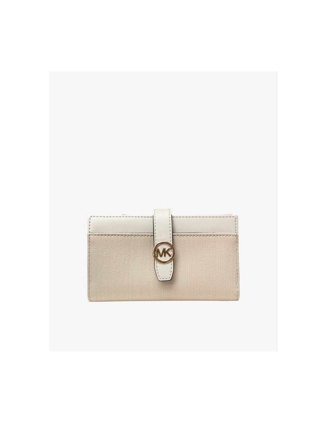 Una billetera compacta y sofisticada, perfecta para llevar lo esencial todos los días. Fabricada en lona lisa de alta calidad, se distingue por su detalle metálico dorado con el logo MK, que aporta un toque elegante sin sobrecargar el diseño.